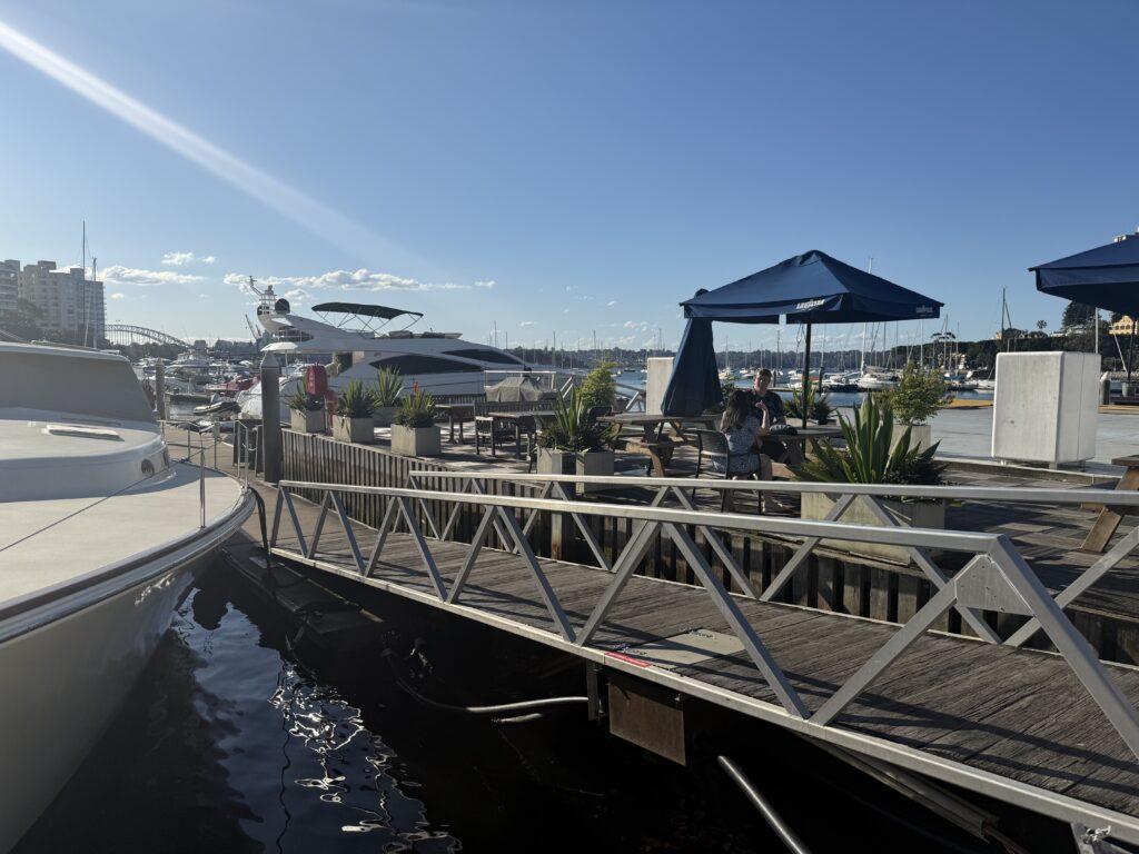 A great dog friendly café metres from the harbourside gorgeous 24 hour off leash Yarranabee Park reasonably priced with great specials Monday to Friday for around $17 - $18 a place where you can sit back and look at gorgeous views all the way to the harbour bridge whilst dreaming which one of the million dollar yachts you will buy when you win lotto, have a lovely lunch and even a naughty beverage as they are licensed.